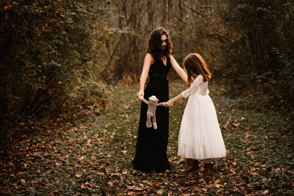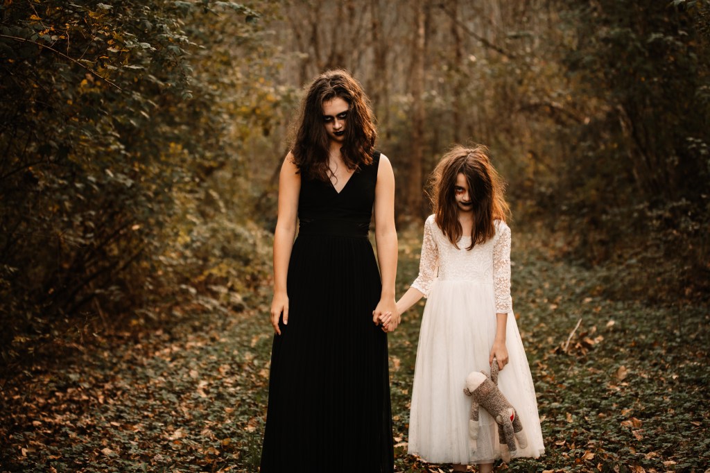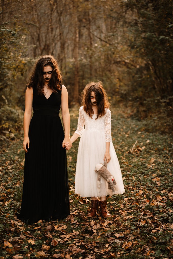 As it turns out, creepy costumes are kind of fun. Watching them jump at every little noise in the woods during this session was a lot of fun for me at least! And all those scary movies I suffered through in my younger years finally came in handy when it came to posing. It did have the girls giving me plenty of side eyes though.